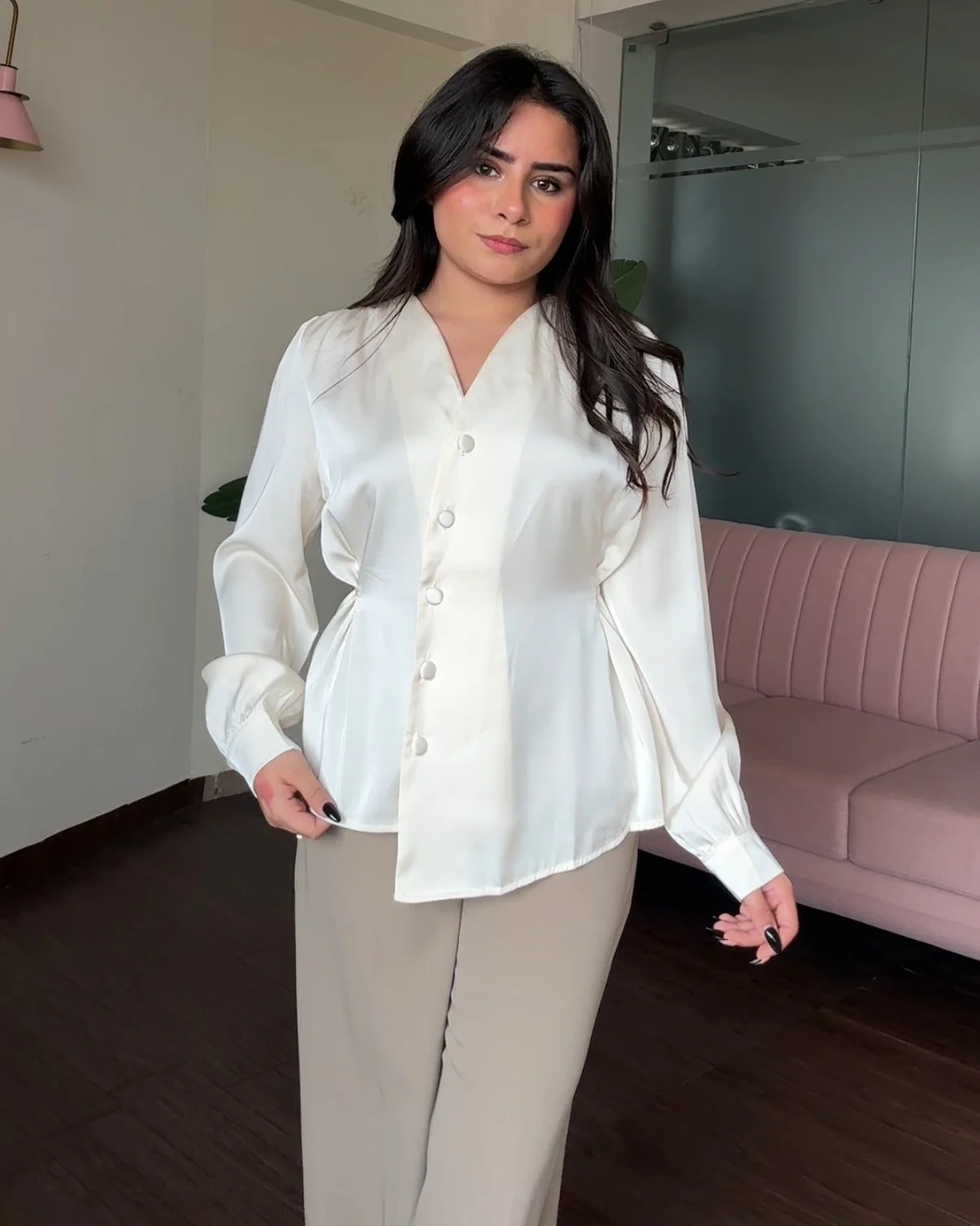 Back Tip Up Solid Hem Detailing Satin Top