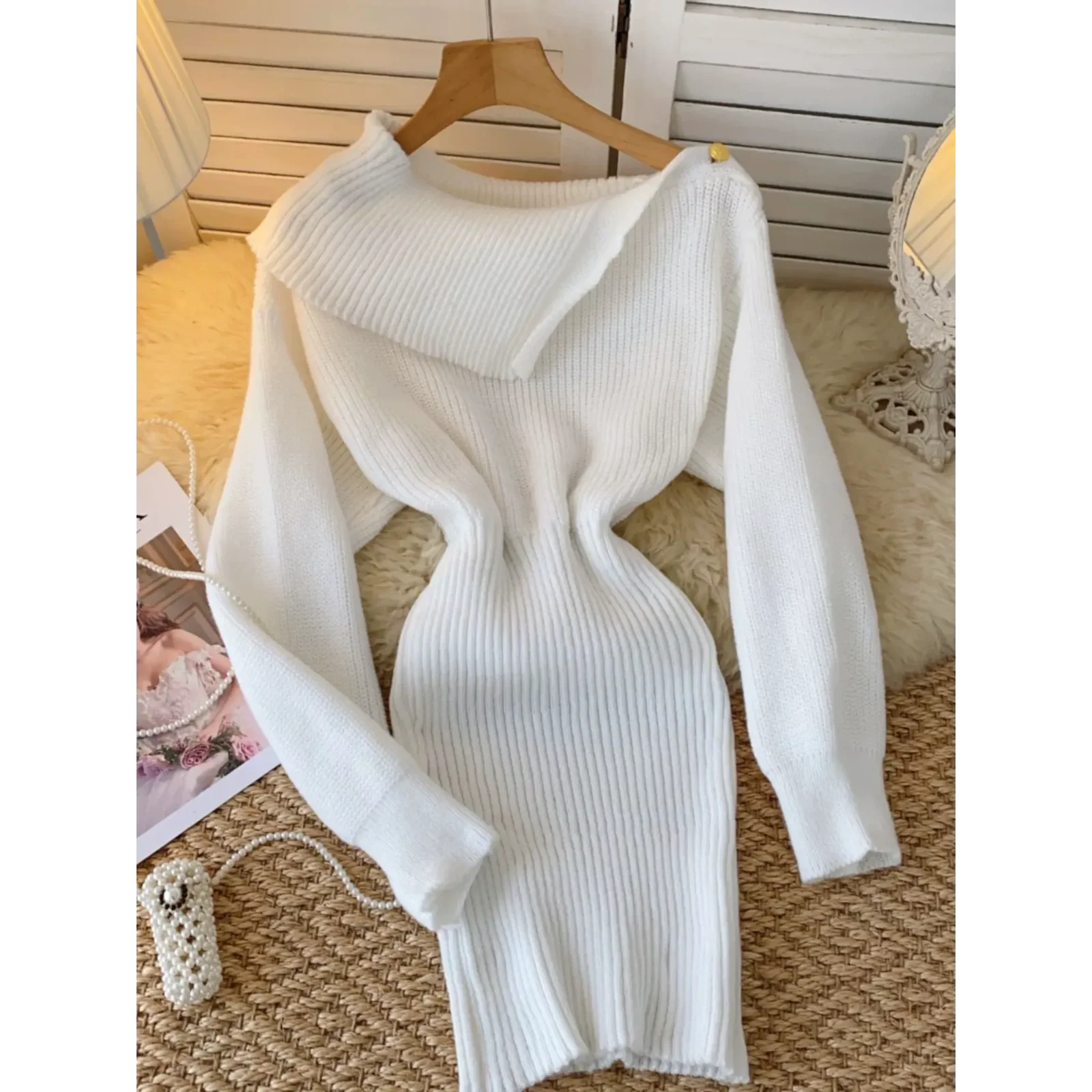 Drop Shoulder Golden Button Detail Sweater Dress