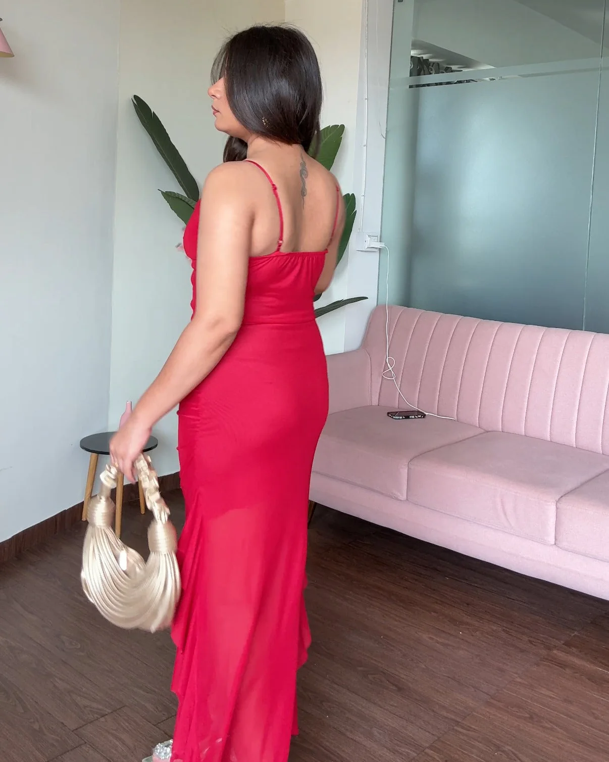 Knot Detailing Ruffle Mesh Bodycon Dress