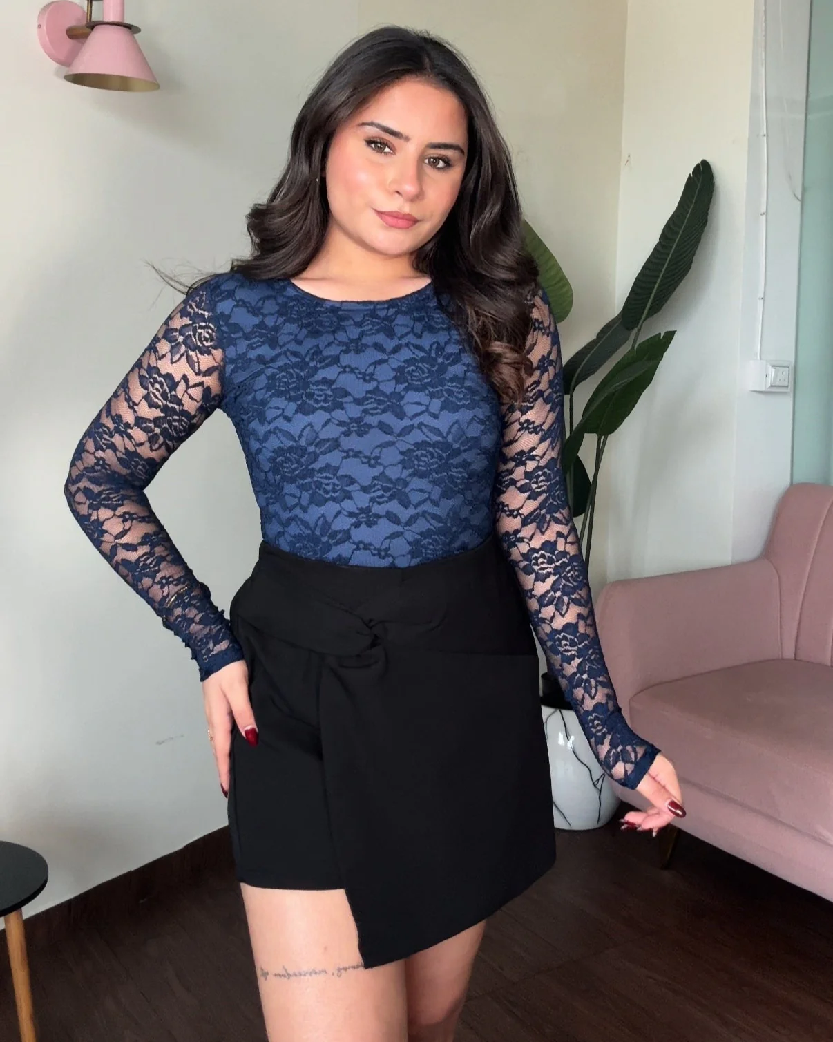 Elegant and feminine, this lacy full sleeve bodysuit features a classic round neck and delicate detailing—perfect for adding a touch of romance to any outfit. Fits XS-M easily.