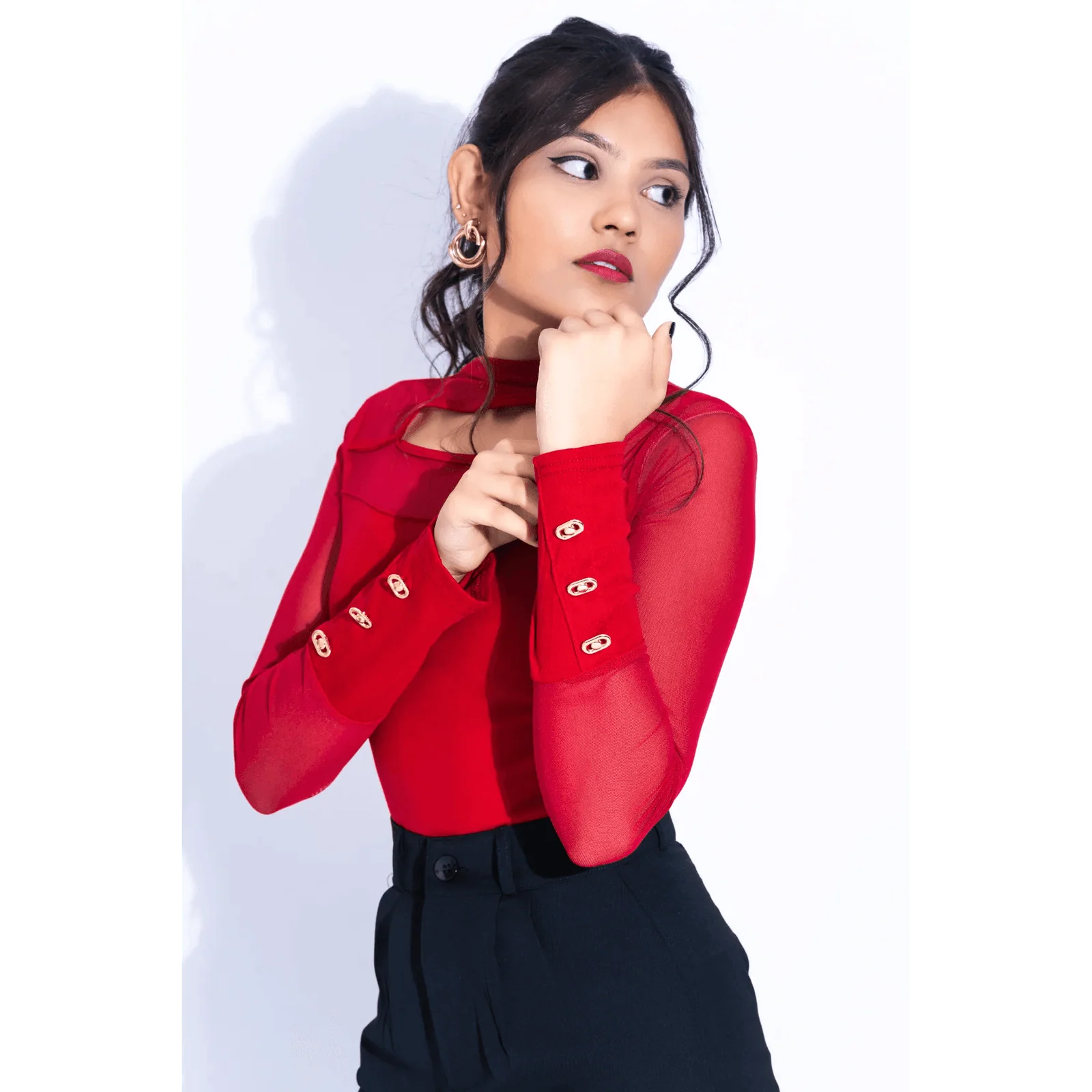- Design: Elegant mesh neck with a stylish cut-out detail