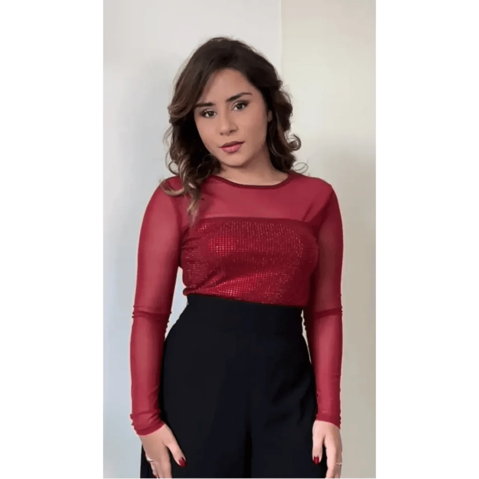This Mesh Rhinestone Top features a delicate mesh fabric adorned with sparkling rhinestones, combining elegance with subtle glamour for standout style.