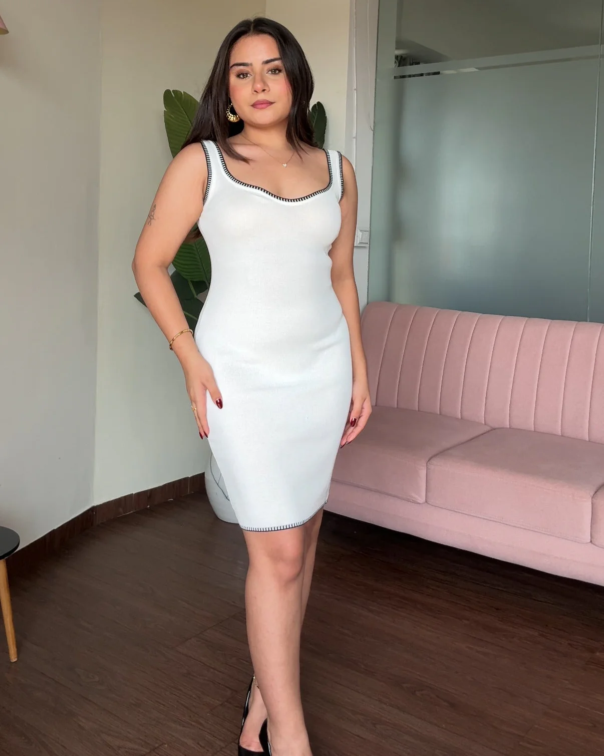 Chic bodycon midi dress featuring a flattering square neckline and bold contrast hem, combining elegance with a modern edge. Fits S-XL easily.