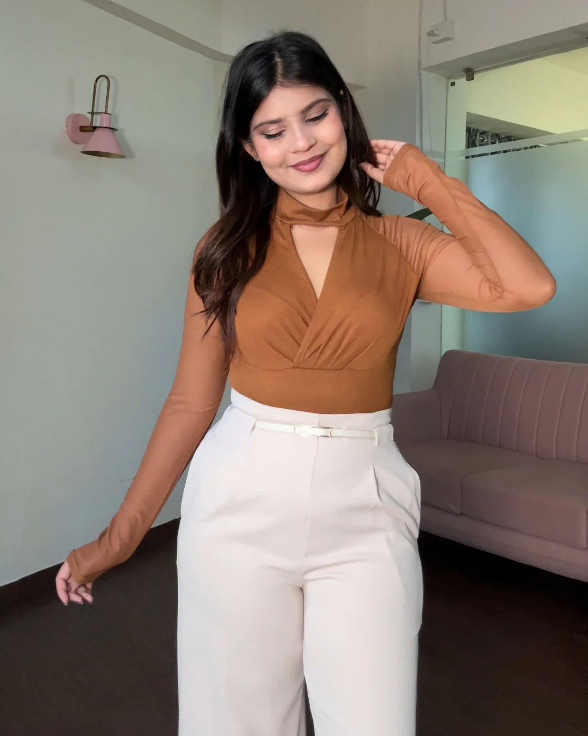 Sophisticated V-neckline top featuring strategic mesh cut-outs that balance coverage with contemporary edge, perfect for layering or standalone styling.